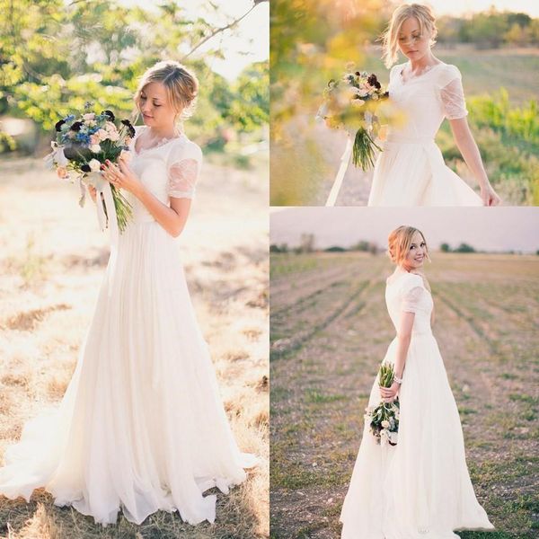 Discount Elegant Lace Chiffon Wedding Dresses A Line New 2019 V Neck Cheap Simple Country Informal Bridal Gowns Spring Short Sleeves Engagement Dress