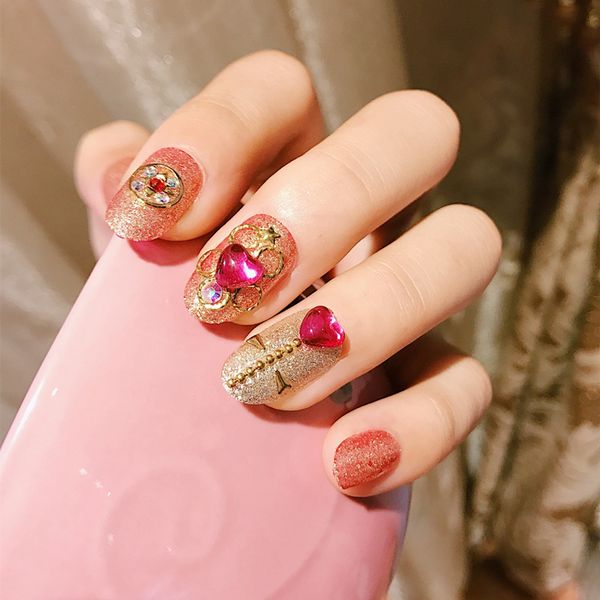 Glitter Solid False Nails Orange Pink Heart Rhinestone Rivet Decorated Oval Medium Full Cover Nail Art Decorations Tips Nails Designs Nail Design From